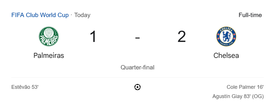 จบเกมการแข่งขันอันสุดมันส์ เชลซีเฉือนชนะพัลไมรัสไปด้วยสกอร์ 2-1 ผ่านเข้าสู่รอบรองชนะเลิศได้สำเร็จในรายการ FIFA Club World Cup เกมนี้โชว์ให้เห็นถึงความนิ่งของเชลซีในจังหวะสำคัญ บวกกับความผิดพลาดเล็กน้อยของพัลไมรัสที่ทำเข้าประตูตัวเองในช่วงท้าย เรียกได้ว่าเป็นเกมที่เต็มไปด้วยความเร็ว ความกดดัน และอารมณ์แฟนบอลแบบสุดขีดจริงๆ ติดตามผลบอลสดและความมันส์แบบนี้ต่อได้ทุกวัน ที่ บ้านกีฬา!