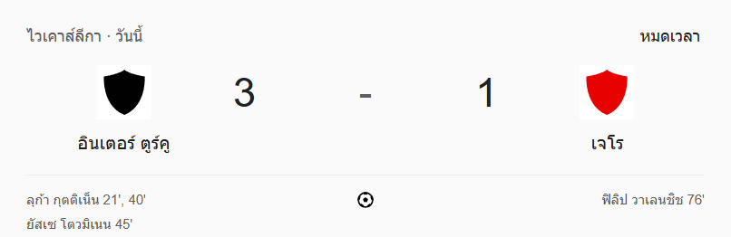 - นาทีที่ 90+6: ผู้ตัดสินเป่าจบการแข่งขัน อินเตอร์ ตูร์คู คว้าชัยในบ้าน 3-1 เก็บสามแต้มสำคัญในลีกอย่างเด็ดขาด