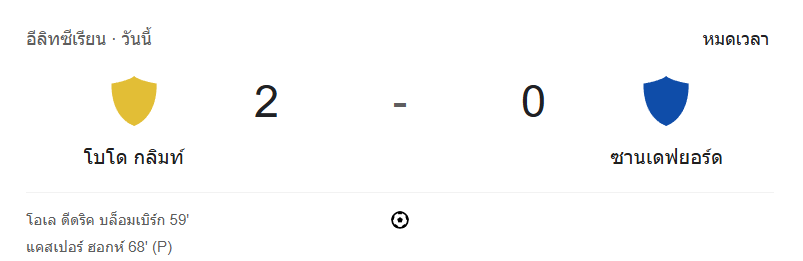 - จบครึ่งแรก: โบโด กลิมท์นำ 2-0 ซานเดฟยอร์ดยังไม่มีโอกาสจบสกอร์แบบจะแจ้ง