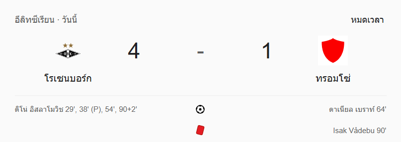 - หมดเวลา: โรเซนบอร์ก เปิดบ้านถล่ม ทรอมโซ่ 4-1 ดิโน่ อิสลามิโวิช เหมาคนเดียว 4 ประตู! ทรอมโซ่แม้จะตีไข่แตกแต่ก็ต้องมาเหลือ 10 คนท้ายเกม สุดท้ายต้านไม่ไหว ต้องยอมรับความพ่ายแพ้กลับบ้าน