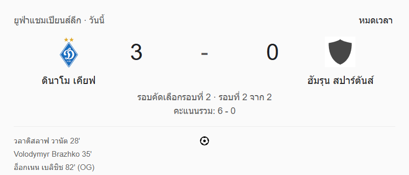 ผลบอลสด ยูฟ่าแชมเปียนส์ลีก ระหว่าง ดินาโม เคียฟ 3-0 ฮัมรุน สปาร์ตันส์ วันนี้ 30/7/68