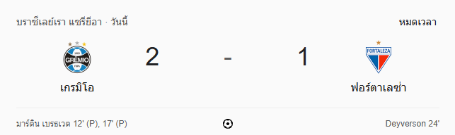 เกมนี้ถือว่าเดือดสมศักดิ์ศรี ผลบอลสด สายบราซิล จังหวะเข้าทำเร็ว ฟาวล์ระห่ำ แท็กติกเกมรับแน่นอน ฟอร์ตาเลซ่าพยายามสู้สุดใจแต่ไล่ไม่ทัน เกรมิโอ้ได้ฮีโร่อย่างเบรธเวตซัดสองจุดโทษสุดเฉียบ ปิดเกมด้วยสามแต้มที่ล้ำค่าในบ้านตัวเอง