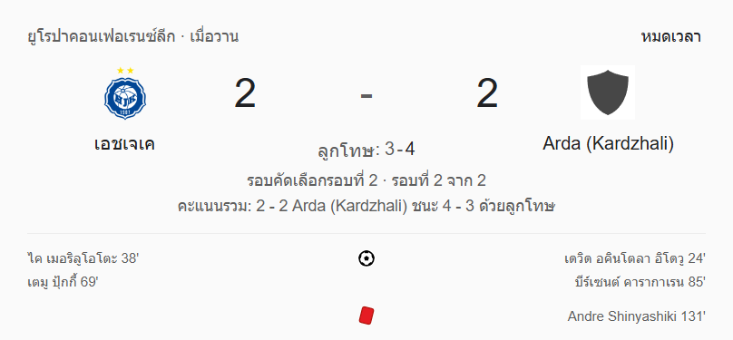 - นาทีที่ 86: GOAL! Birsent Karagaren (Arda) ยิงจ่อ ๆ ตีเสมอให้ Arda 2-2 หลังแนวรับ HJK เคลียร์ไม่ขาด