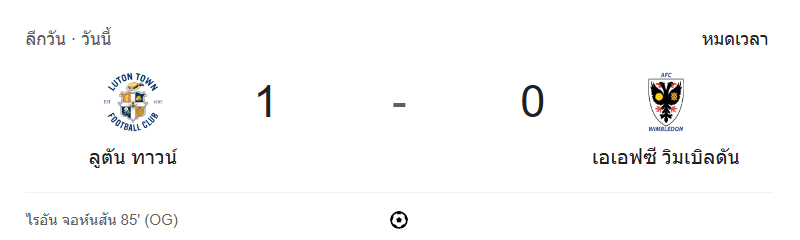 - หมดเวลา: ลูตัน ทาวน์ เฉือนเอาชนะวิมเบิลดัน 1-0 จากประตูโอว์นโกลช่วงท้ายเกม เก็บ 3 แต้มสำคัญในบ้านแบบหืดจับ!