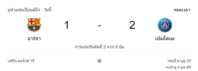 - นาทีที่ 95: จบเกม! ปารีส แซงต์ แชร์กแมง บุกพลิกชนะ บาร์เซโลนา 1-2 คว้า 3 แต้มสุดระทึก!