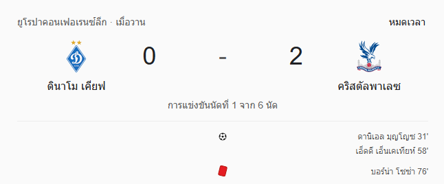 - นาทีที่ 96: จบเกม! ดินาโม เคียฟ เปิดบ้านแพ้ คริสตัล พาเลซ 0-2 ทีมเยือนเก็บสามแต้มไปได้สำเร็จ