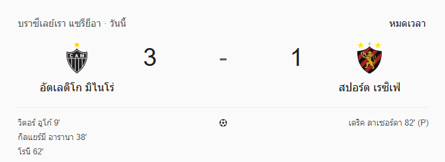 ผลบอลสด กังเปโอนาตู บราซีเลย์รู แซรียีอา ระหว่าง อัตเลติโก มิไนโร่ 3-1 สปอร์ต คลับ เรซิเฟ่ พีอี วันนี้ 9/10/68