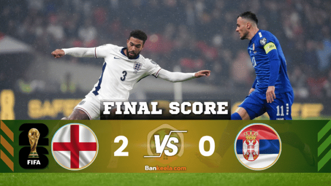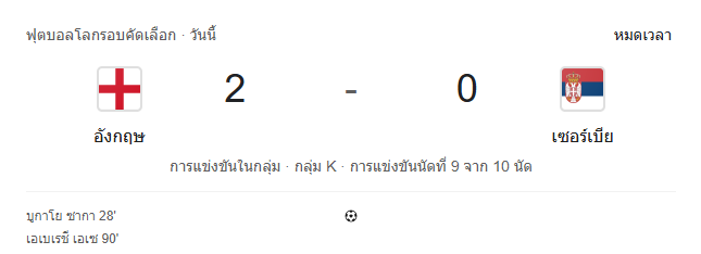 อังกฤษโชว์คลาสเหนือชั้น สมกับเป็นเต็งหนึ่งของกลุ่ม K ชนะรวด 8 นัดติดต่อกัน เก็บ 21 คะแนนเต็ม นำโด่งบนตารางโดยไม่เสียประตูในเกมนี้อีกครั้ง ซาก้า คว้า “แมนออฟเดอะแมตช์” ด้วยเรตติ้ง 8.1 จากการยิงหนึ่งจ่ายหนึ่ง ส่วนเซอร์เบียแม้พยายามเต็มที่ แต่เกมรุกไม่เฉียบพอจะเจาะแนวรับที่แข็งแกร่งของ “สิงโตคำราม”