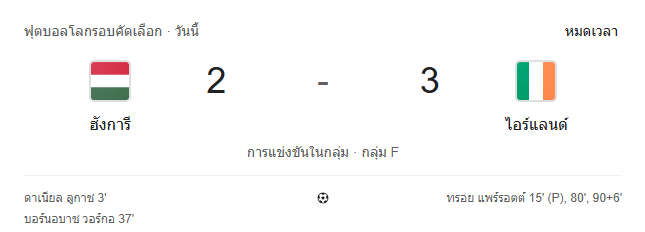 ศึกฟุตบอลโลก 2026 รอบคัดเลือก โซนยุโรป กลุ่ม F ระหว่าง ฮังการี พบ ไอร์แลนด์ กลายเป็นเกมสุดเดือดที่แฟนบอลต้องตามลุ้นกันจนหยดสุดท้ายแบบ ผลบอลสด ที่เปลี่ยนหน้าอยู่ตลอดเวลา ฮังการีออกนำก่อน 1-0 และนำ 2-1 แต่โดนไอร์แลนด์รัวสองเม็ดท้ายเกม โดยเฉพาะลูกปิดกล่องนาที 90+6 ที่ทำให้ไอร์แลนด์บุกเก็บชัย 3-2 แบบสุดช็อก