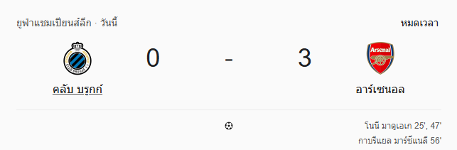 ศึกยูฟ่าแชมเปียนส์ลีกค่ำคืนนี้ระอุเดือด เมื่อ อาร์เซนอล โชว์ฟอร์มสุดซ่า บุกถล่ม คลับบรูซ ถึงบ้านแบบไม่ปรานี 3-0 บ้านกีฬาเก็บทุกช็อตสำคัญพร้อมสรุป ผลบอลสด แบบเข้มข้นให้แฟนบอลได้มันถึงใจ เพราะนี่คือหนึ่งในเกมที่ “ปืนใหญ่” เดินหน้าฆ่าไม่เลี้ยงตั้งแต่นาทีแรกจนหมดเวลา!