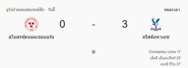 บ้านกีฬา ขอสรุป ผลบอล ศึก ยูฟ่ายูโรปาคอนเฟอเรนซ์ลีก ที่แฟนบอลจับตา เมื่อ คริสตัล พาเลซ ระเบิดฟอร์มสุดดุดัน บุกอัด เชลบอร์น ถึงถิ่นแบบไม่ไว้หน้า 3-0 เกมนี้คือบทพิสูจน์คุณภาพของทีมเยือนอย่างแท้จริง ทั้งความเฉียบคม เกมรุกที่หลากหลาย และวินัยเกมรับที่แน่นหนา จบ 90 นาทีด้วยผลการแข่งขันที่สะท้อนภาพรวมของเกมได้ชัดเจน