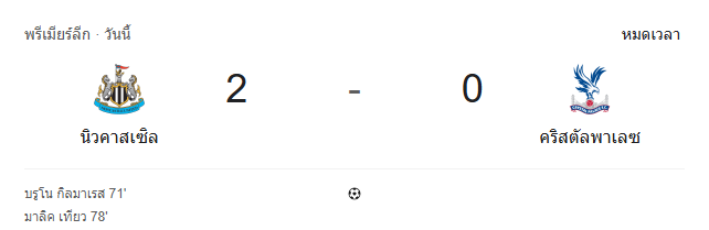 - หมดเวลา: นิวคาสเซิล ยูไนเต็ด 2-0 คริสตัล พาเลซ