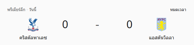 - หมดเวลา: คริสตัล พาเลซ 0-0 แอสตัน วิลลา