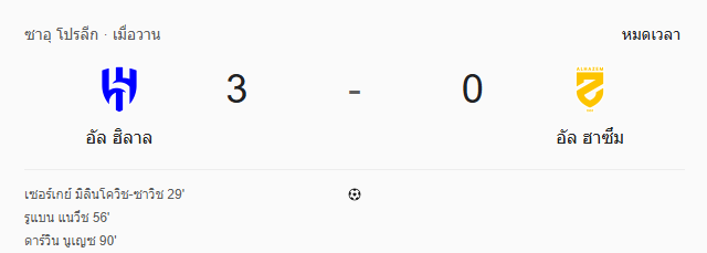 - หมดเวลา: อัล ฮิลาล ชนะ อัล ฮาเซ็ม 3-0