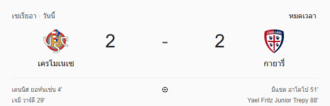 - หมดเวลา: เครโมเนเซ เสมอ กายารี่ 2-2