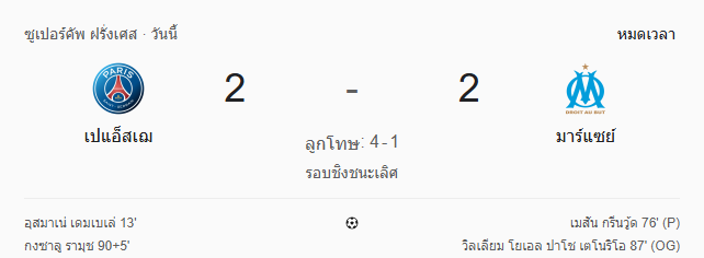 บ้านกีฬา ขอสรุป ผลบอลสด เกมซูเปอร์บิ๊กแมตช์ของฝรั่งเศสในศึก โทรเฟ่ เดส์ ช็องปิยงส์ ที่แฟนบอลทั้งโลกจับตา เมื่อ ปารีส แซงต์ แชร์กแมง เปิดศึกเดือดกับคู่ปรับตลอดกาล โอลิมปิก มาร์กเซย ผลจบลงแบบสุดมันส์เสมอ 2-2 ในเวลา ก่อนที่ เปแอสเช จะเฉือนชนะในการดวลจุดโทษ 4-1 คว้าแชมป์ไปครองอย่างสะใจ