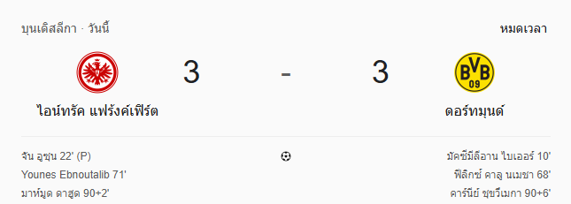 - หมดเวลา: ไอน์ทรัค แฟรงก์เฟิร์ต เสมอ โบรุสเซีย ดอร์ทมุนด์ 3-3