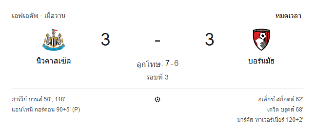 บ้านกีฬา ขอสรุป ผลบอล เอฟเอ คัพ รอบที่ 3 เกมสุดมันที่แฟนบอลห้ามกระพริบตา นิวคาสเซิ่ล ยูไนเต็ด เปิดบ้านเจอ บอร์นมัธ เอเอฟซี ก่อนจะดวลกันยาว 120 นาทีแบบไม่มีใครยอมใคร จบเสมอ 3-3 ต้องตัดสินด้วยการดวลจุดโทษ และเป็น “สาลิกาดง” ที่นิ่งกว่า เอาชนะไปแบบใจหายใจคว่ำ 7-6 ผ่านเข้ารอบได้อย่างสุดเดือด