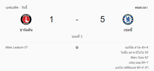 บ้านกีฬา ขอสรุป ผลบอล เอฟเอ คัพ คู่เดือดที่คอบอลห้ามพลาด เมื่อคืนที่ผ่านมา กับเกมที่แฟน ๆ ค้นหา ผลบอลสด กันแทบทั้งคืน หลังจาก เชลซี แสดงพลังเกมรุกแบบไม่ปรานี บุกไล่ถล่ม ชาร์ลตัน แอธเลติก ถึงถิ่นด้วยสกอร์ขาดลอย 5-1 ผ่านเข้าสู่รอบต่อไปอย่างดุดัน สมศักดิ์ศรียักษ์ใหญ่จากพรีเมียร์ลีก
