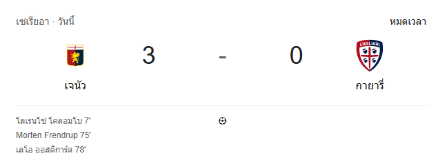 ชัยชนะเกมนี้ตอกย้ำว่าฟอร์มของ เจนัว กำลังเข้าที่เข้าทาง เกมรุกเฉียบ เกมรับแน่น เล่นด้วยความมั่นใจทุกจังหวะ ขณะที่ กายารี่ ต้องกลับไปทบทวนอย่างหนัก เพราะรูปเกมเป็นรองชัดเจนแทบตลอด 90 นาที