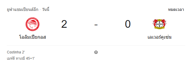 • หมดเวลา: โอลิมเปียกอส 2-0 เลเวอร์คูเซ่น
