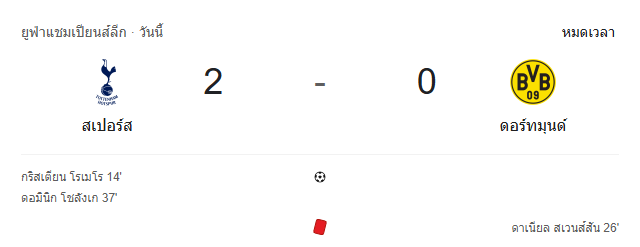 - หมดเวลา: สเปอร์ส 2-0 ดอร์ทมุนด์