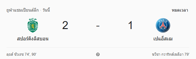 - หมดเวลา: สปอร์ติง ลิสบอน 2-1 ปารีส แซงต์ แชร์กแมง