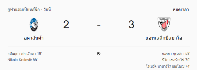 - หมดเวลา: อตาลันต้า 2-3 แอธเลติก บิลเบา