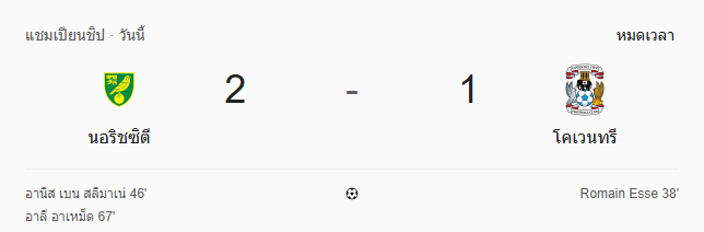 - หมดเวลา: นอริช ซิตี้ 2-1 โคเวนทรี ซิตี้