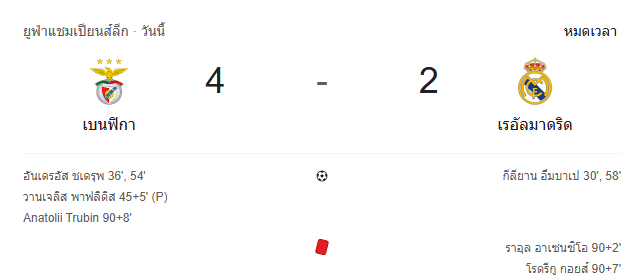 - หมดเวลา: เบนฟิกาเปิดบ้านเอาชนะ เรอัล มาดริด 4-2