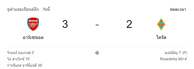 - หมดเวลา: อาร์เซนอลเฉือนชนะ ไครัต 3-2