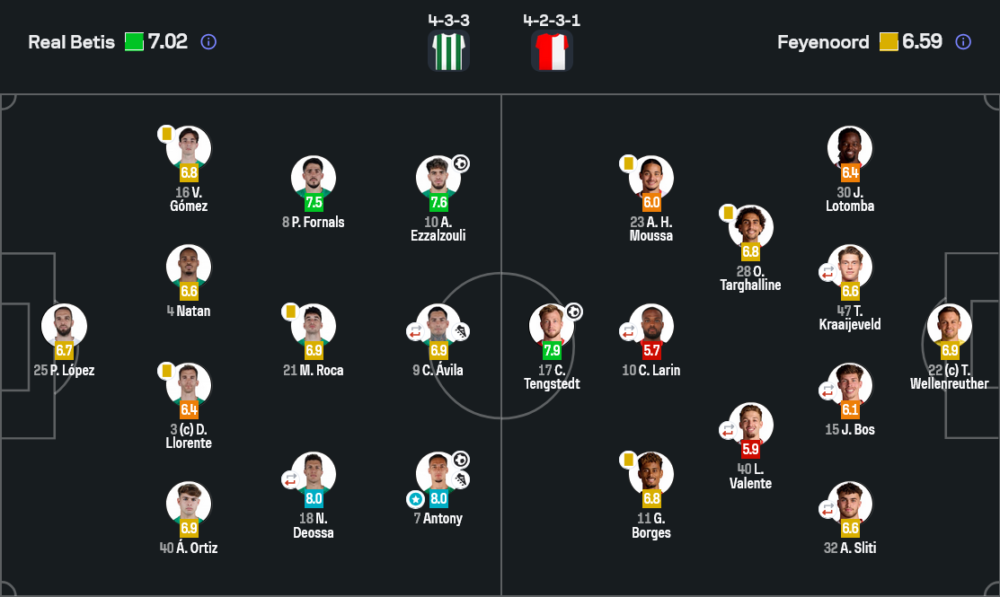 ท้ายเกมทีมเยือนโหมบุกอย่างหนัก ได้ทั้งฟรีคิก เตะมุม และจังหวะยิงไกล แต่ความเฉียบคมยังไม่พอ ขณะที่แนวรับเบติสแม้เริ่มล้าแต่ยังช่วยกันบล็อกได้ดี นาที 90+1, 90+4 และ 90+6 มาร์ก โรกา, วาเลนติน โกเมซ และ ดีเอโก้ ยอเรนเต้ รับใบเหลืองคนละใบจากการตัดฟาวล์และถ่วงเวลาเพื่อปิดเกม ด้าน กุสตาโว บอร์เกส ของเฟเยนูร์ดโดนเหลืองเพิ่มในช่วง 90+7 จากจังหวะโต้เถียงผู้ตัดสิน