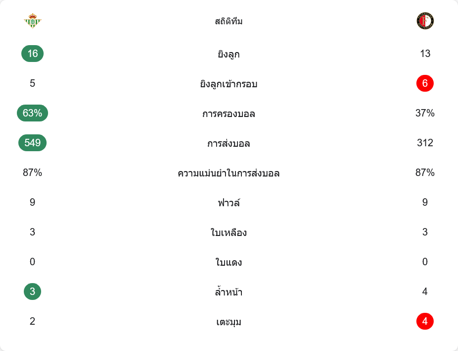 ตัวเลขหลังเกมบอกภาพได้ชัดเจน เรอัล เบติสครองบอลมากถึง 63% เทียบกับ 37% ของเฟเยนูร์ด แสดงถึงการคอนโทรลจังหวะเกมในบ้านอย่างเต็มรูปแบบ เจ้าถิ่นยิงรวม 16 ครั้ง เข้ากรอบ 5 ครั้ง และเปลี่ยนเป็นสองประตู ขณะที่ทีมเยือนยิง 13 ครั้ง เข้ากรอบมากกว่าที่ 6 ครั้ง แต่เปลี่ยนเป็นสกอร์ได้แค่ลูกเดียว