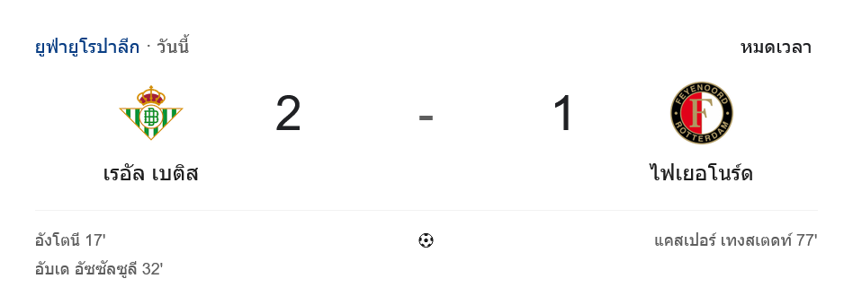 หมดเวลา เรอัล เบติส รักษาสกอร์ 2-1 เอาไว้ได้ต่อหน้าแฟนบอล ขณะที่เฟเยนูร์ดต้องกลับบ้านมือเปล่า แม้ครึ่งหลังจะเล่นได้ดีกว่าอย่างเห็นได้ชัด