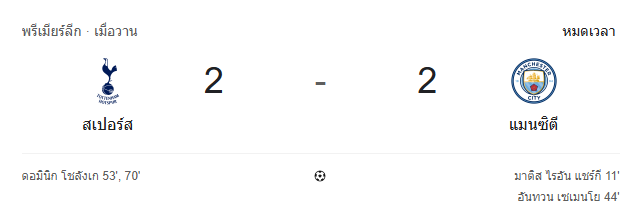 - หมดเวลา: สเปอร์ส เสมอ แมนเชสเตอร์ ซิตี้ 2-2