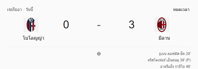 - หมดเวลา: โบโลญญ่า แพ้ เอซี มิลาน 0-3