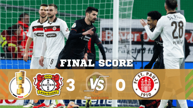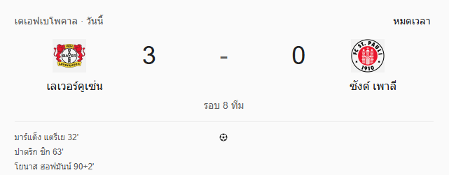 - หมดเวลา: เลเวอร์คูเซ่น ชนะ ซังต์ เพาลี 3-0 ผ่านเข้าสู่รอบรองชนะเลิศ