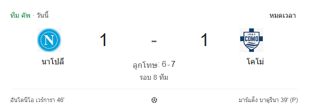 - หมดเวลา: นาโปลี 1-1 โคโม่ ต้องตัดสินด้วยการดวลจุดโทษ