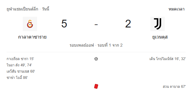 - หมดเวลา: กาลาตาซาราย 5-2 ยูเวนตุส