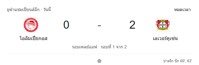 ผลบอลสด ยูฟ่า แชมเปี้ยนส์ ลีก ระหว่าง โอลิมเปียกอส vs ไบเออร์ เลเวอร์คูเซ่น วันนี้ 19/2/69 ดูบอลย้อนหลัง คลิปไฮไลท์ ดูบอล ยูฟ่า แชมเปี้ยนส์ ลีก
