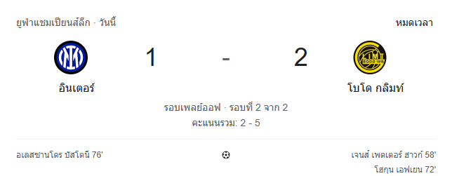 แม้อินเตอร์จะครองเกมบุก มีโอกาสหลายครั้งทั้งลูกโหม่งชนเสา และลูกยิงติดเซฟของ นิกิต้า ไฮคิน แต่ความเด็ดขาดเป็นของทีมเยือนอย่างชัดเจน สุดท้ายเสียงนกหวีดดังขึ้น พร้อมความจริงที่เจ็บปวดสำหรับแฟนงูใหญ่ ผลการแข่งขันนี้ทำให้ โบโด กลิมท์ ผ่านเข้ารอบด้วยสกอร์รวม 5-2 ขณะที่ อินเตอร์ มิลาน ต้องยุติเส้นทางในถ้วยใหญ่ยุโรปเพียงเท่านี้