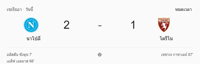 นาโปลีทำเกมได้เหนือกว่าและขึ้นนำสองประตู ก่อนที่โตริโน่จะตีไข่แตกช่วงท้ายเกม แต่ไม่ทัน ทำให้เจ้าบ้านเก็บสามแต้มสำคัญไปได้สำเร็จ. เสียงนกหวีดสุดท้ายดังขึ้น พร้อมสกอร์ นาโปลี 2-1 โตริโน่ เกมนี้เจ้าถิ่นแสดงให้เห็นถึงความเฉียบคมในจังหวะจบสกอร์ โดยเฉพาะสองประตูสำคัญจาก Alisson Santos และ Eljif Elmas ที่ช่วยให้ทีมเก็บสามแต้มเต็มในศึก กัลโช่ เซเรีย อา แม้โตริโน่จะยิงคืนได้ช่วงท้ายเกม แต่ก็ไม่ทันการณ์ ทำให้ต้องกลับบ้านมือเปล่า ขณะที่นาโปลียังคงรักษาฟอร์มการเล่นที่แข็งแกร่งในลีกต่อไป
