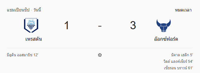- หมดเวลา: เพรสตัน นอร์ธ เอนด์ 1-3 อ็อกซ์ฟอร์ด ยูไนเต็ด