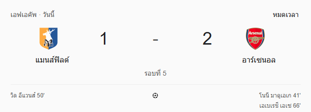 - หมดเวลา: แมนส์ฟิลด์ ทาวน์ 1-2 อาร์เซนอล
