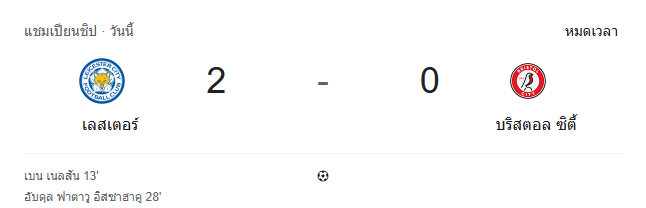 - หมดเวลา: เลสเตอร์ ซิตี้ 2-0 บริสตอล ซิตี้ ⚽