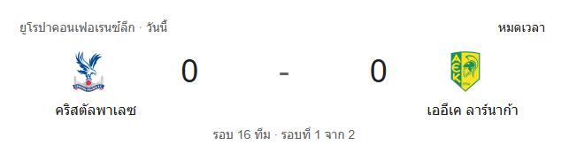 ผลการแข่งขัน คริสตัล พาเลซ 0-0 เออีเค ลาร์นาก้า ทำให้ศึก ยูฟ่า ยูโรปา คอนเฟอเรนซ์ ลีก รอบ 16 ทีมสุดท้าย ยังไม่มีทีมใดได้เปรียบ พาเลซอาจเป็นฝ่ายครองเกมและสร้างโอกาสได้มากกว่า แต่ไม่สามารถเปลี่ยนเป็นประตูได้ ขณะที่ลาร์นาก้าแสดงให้เห็นถึงเกมรับที่แข็งแกร่งและมีระเบียบ ทุกอย่างจึงยังต้องไปตัดสินกันในเกมเลกสองที่อาจเดือดกว่านี้หลายเท่า