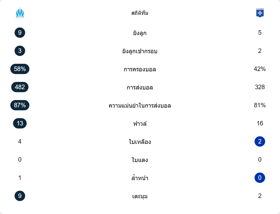 เกมนี้มาร์กเซยเหนือกว่าทั้งรูปเกมและตัวเลข พวกเขายิง 9 ครั้ง เข้ากรอบ 3 ครั้ง ครองบอล 58 เปอร์เซ็นต์ และได้เตะมุมถึง 9 ครั้ง ขณะที่โอแซร์ยิง 5 ครั้ง เข้ากรอบ 2 ครั้ง ครองบอล 42 เปอร์เซ็นต์ และได้เตะมุม 2 ครั้งเท่านั้น ด้านการผ่านบอล มาร์กเซยทำได้ 482 ครั้ง แม่นยำ 87 เปอร์เซ็นต์ ส่วนโอแซร์จ่าย 328 ครั้ง แม่นยำ 81 เปอร์เซ็นต์ ภาพรวมจึงเป็นเกมที่เจ้าบ้านคุมไว้ได้มากกว่า ก่อนเปลี่ยนแรงกดดันเป็นประตูชัยในที่สุด