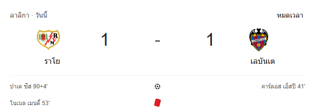 - หมดเวลา: ราโย บาเยกาโน่ 1-1 เลบันเต้ แม้จะเหลือผู้เล่น 10 คน แต่ราโยยังฮึดตีเสมอช่วงทดเวลาบาดเจ็บ แบ่งแต้มกับเลบันเต้ไปอย่างดุเดือด ⚽