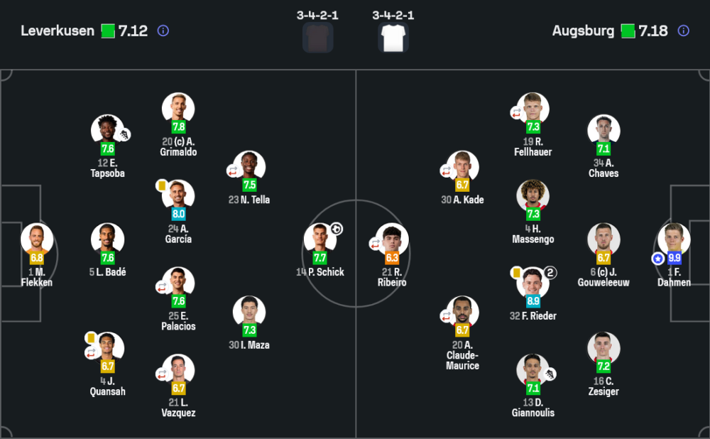 ฟินน์ ดาห์เมน คือพระเอกของเกมแบบไม่ต้องเถียง นายด่านเอาก์สบวร์กได้คะแนนสูงสุด 9.9 และเซฟหลายจังหวะสำคัญ โดยเฉพาะช่วงท้ายที่ป้องกันลูกยิงจ่อของเลเวอร์คูเซ่นไว้ได้อย่างเหลือเชื่อ เป็นหัวใจหลักที่พาทีมบุกเก็บสามแต้ม