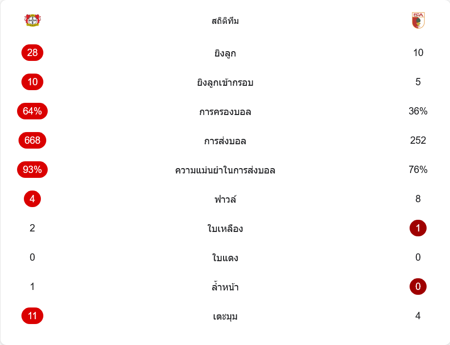 แม้เลเวอร์คูเซ่นจะครองบอล 64 เปอร์เซ็นต์ ยิงมากถึง 28 ครั้ง เข้ากรอบ 10 ครั้ง และผ่านบอลแม่นถึง 93 เปอร์เซ็นต์ แต่กลับเปลี่ยนโอกาสเป็นประตูได้เพียงลูกเดียว ต่างจากเอาก์สบวร์กที่มีโอกาสยิง 10 ครั้ง เข้ากรอบ 5 หน และใช้จังหวะสำคัญได้คมกว่า เกมนี้จึงเป็นตัวอย่างชัดเจนของทีมที่เล่นเหนือกว่าแต่จบไม่ลง